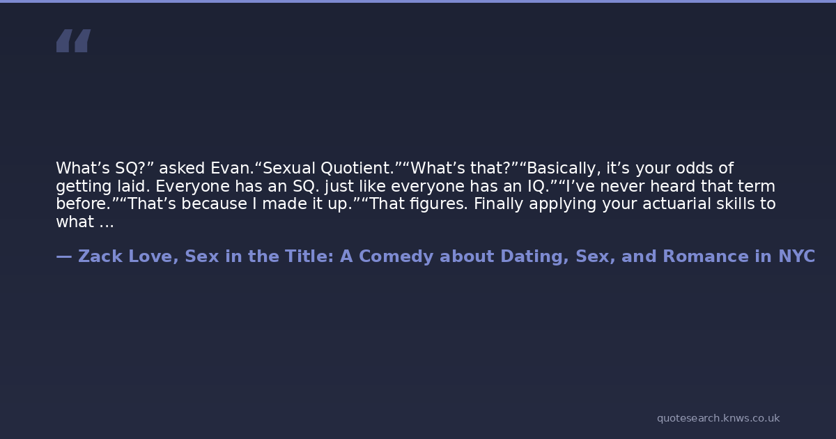 What’s SQ?” asked Evan.“Sexual Quotient.”“What’s that?”“Basically, it’s your odds of getting laid. Everyone has an SQ. just like everyone has an IQ.”“I’ve never heard that term before.”“That’s because I made it up.”“That figures. Finally applying your actuarial skills to what really matters, eh?
