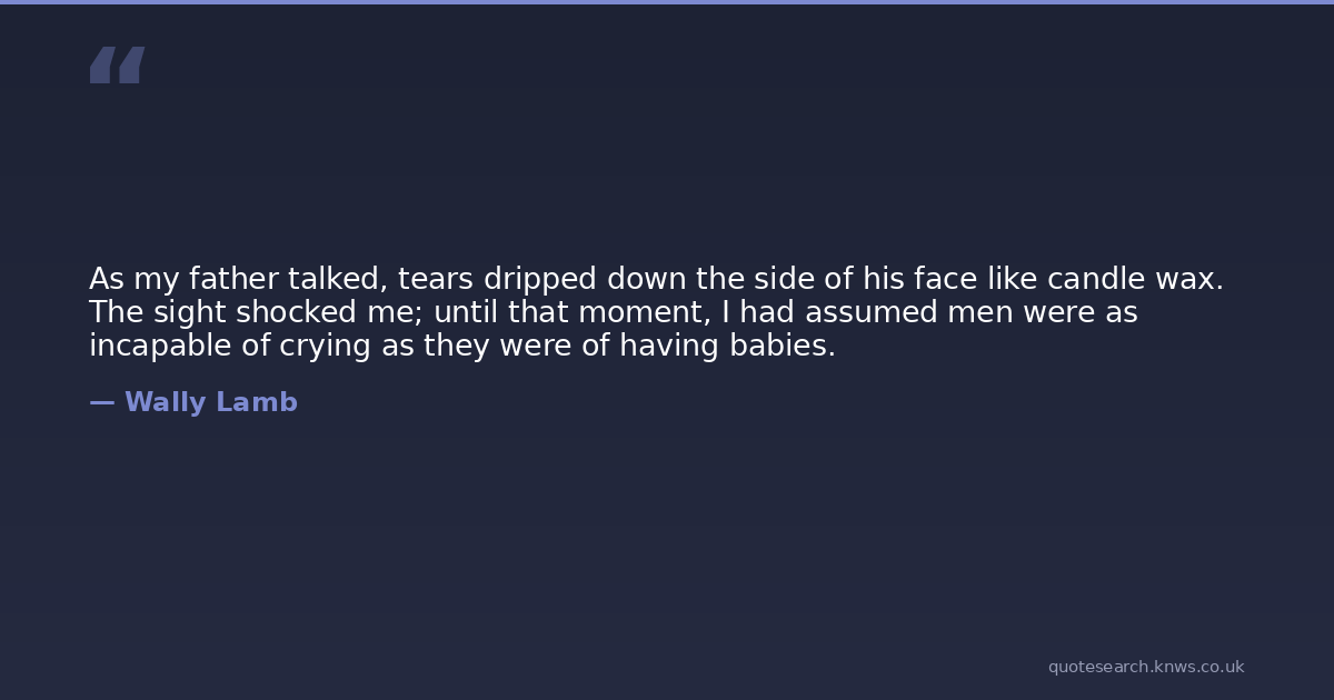As my father talked, tears dripped down the side of his face like candle wax. The sight shocked me; until that moment, I had assumed men were as incapable of crying as they were of having babies.