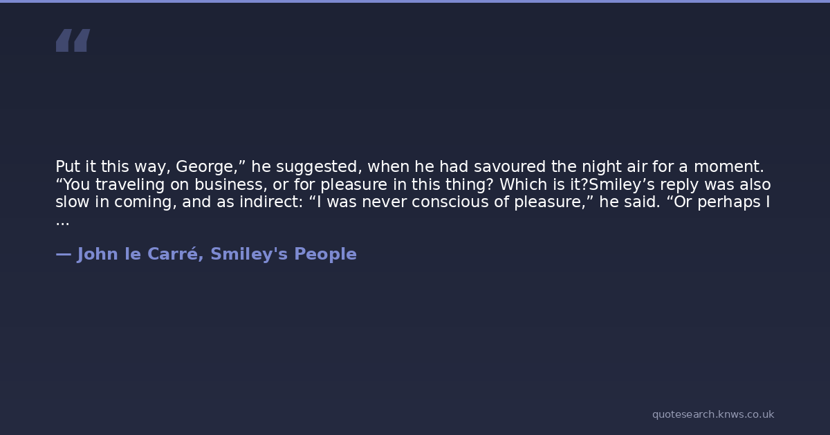 Put it this way, George,” he suggested, when he had savoured the night air for a moment. “You traveling on business, or for pleasure in this thing? Which is it?Smiley’s reply was also slow in coming, and as indirect: “I was never conscious of pleasure,” he said. “Or perhaps I mean: of the distinction.