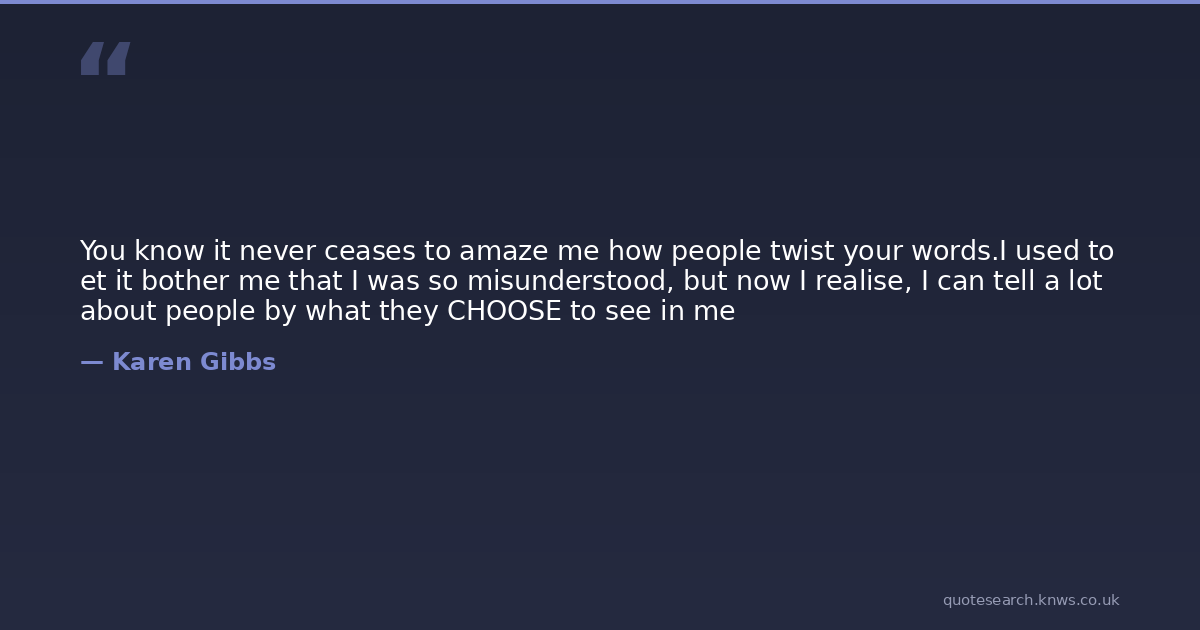 You know it never ceases to amaze me how people twist your words.I used to et it bother me that I was so misunderstood, but now I realise, I can tell a lot about people by what they CHOOSE to see in me