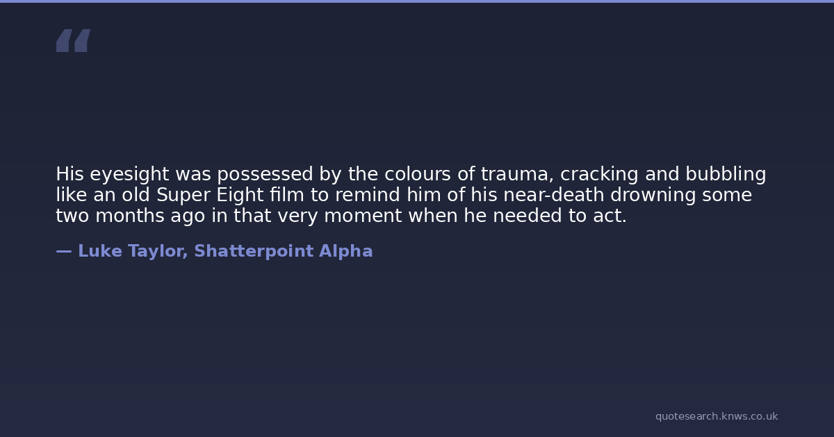His eyesight was possessed by the colours of trauma, cracking and bubbling like an old Super Eight film to remind him of his near-death drowning some two months ago in that very moment when he needed to act.