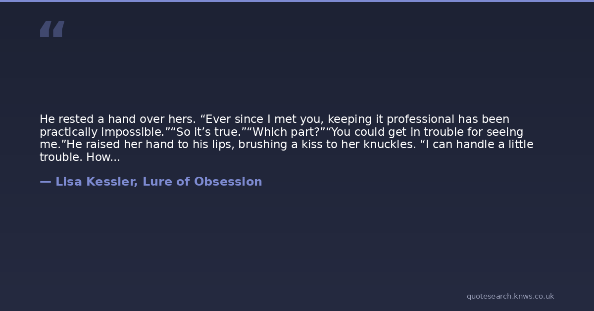 He rested a hand over hers. “Ever since I met you, keeping it professional has been practically impossible.”“So it’s true.”“Which part?”“You could get in trouble for seeing me.”He raised her hand to his lips, brushing a kiss to her knuckles. “I can handle a little trouble. How about you?”Scars and a thrill seeker. Gods help her…