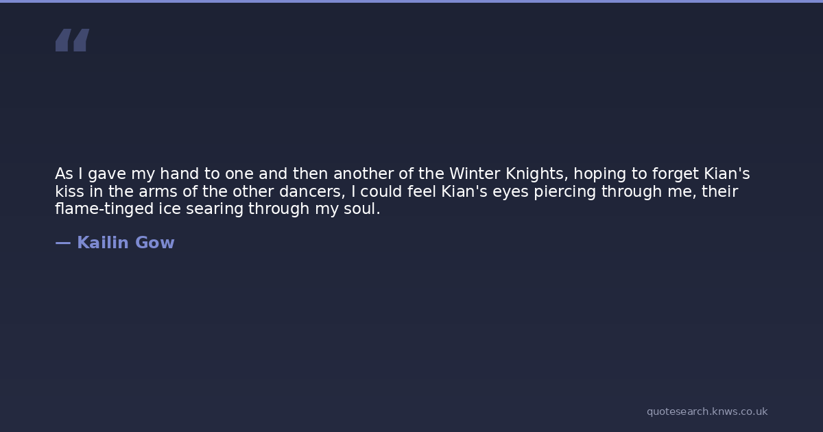 As I gave my hand to one and then another of the Winter Knights, hoping to forget Kian's kiss in the arms of the other dancers, I could feel Kian's eyes piercing through me, their flame-tinged ice searing through my soul.