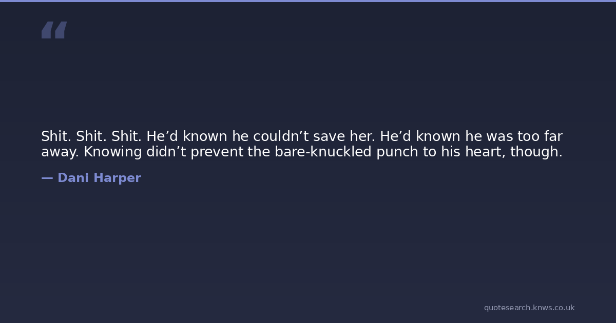Shit. Shit. Shit. He’d known he couldn’t save her. He’d known he was too far away. Knowing didn’t prevent the bare-knuckled punch to his heart, though.