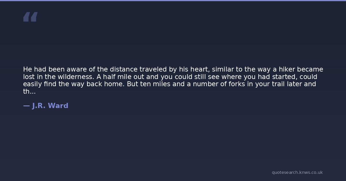 He had been aware of the distance traveled by his heart, similar to the way a hiker became lost in the wilderness. A half mile out and you could still see where you had started, could easily find the way back home. But ten miles and a number of forks in your trail later and there was no going back. At that point, you had no choice but to marshal the resources to build yourself a shelter and put down fresh roots.