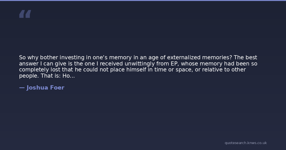 So why bother investing in one’s memory in an age of externalized memories? The best answer I can give is the one I received unwittingly from EP, whose memory had been so completely lost that he could not place himself in time or space, or relative to other people. That is: How we perceive the world and how we act in it are products of how and what we remember. We’re all just a bundle of habits shaped by our memories. And to the extent that we control our lives, we do so by gradually altering those habits, which is to say the networks of our memories. No lasting joke, invention, insight, or work of art was ever produced by an external memory. Not yet, at least. Our ability to find humor in the world, to make connections between previously unconnected notions, to create new ideas, to share in a common culture: All these essentially human acts depend on memory. Now more than ever, as the role of memory in our culture erodes at a faster pace than ever before, we need to cultivate our ability to remember. Our memories make us who we are. They are the seat of our values and source of our character.