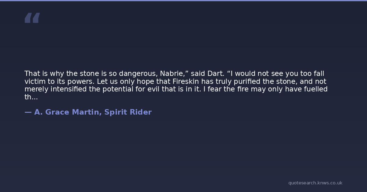 That is why the stone is so dangerous, Nabrie,” said Dart. “I would not see you too fall victim to its powers. Let us only hope that Fireskin has truly purified the stone, and not merely intensified the potential for evil that is in it. I fear the fire may only have fuelled the power of the spirits in its heart.