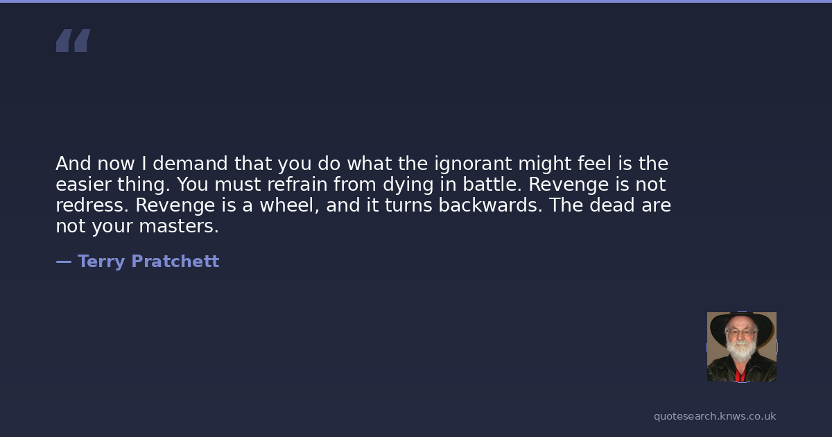 And now I demand that you do what the ignorant might feel is the easier thing. You must refrain from dying in battle. Revenge is not redress. Revenge is a wheel, and it turns backwards. The dead are not your masters.