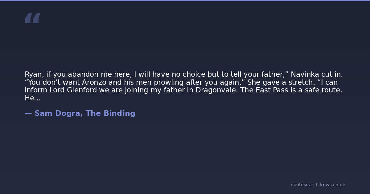 Ryan, if you abandon me here, I will have no choice but to tell your father,” Navinka cut in. “You don’t want Aronzo and his men prowling after you again.” She gave a stretch. “I can inform Lord Glenford we are joining my father in Dragonvale. The East Pass is a safe route. He will not insist on sending a further escort.” She flashed a deadly smile. “I can make your life easier or more difficult. I leave the choice to you.