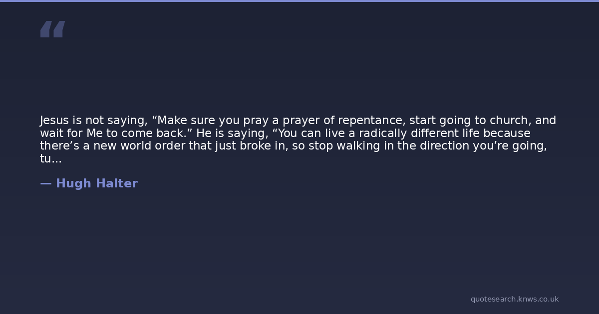 Jesus is not saying, “Make sure you pray a prayer of repentance, start going to church, and wait for Me to come back.” He is saying, “You can live a radically different life because there’s a new world order that just broke in, so stop walking in the direction you’re going, turn 180 degrees, and walk toward Me and life in the kingdom of God.”Halter, Hugh (2014-02-01). Flesh: Bringing the Incarnation Down to Earth (p. 53). David C. Cook. Kindle Edition.