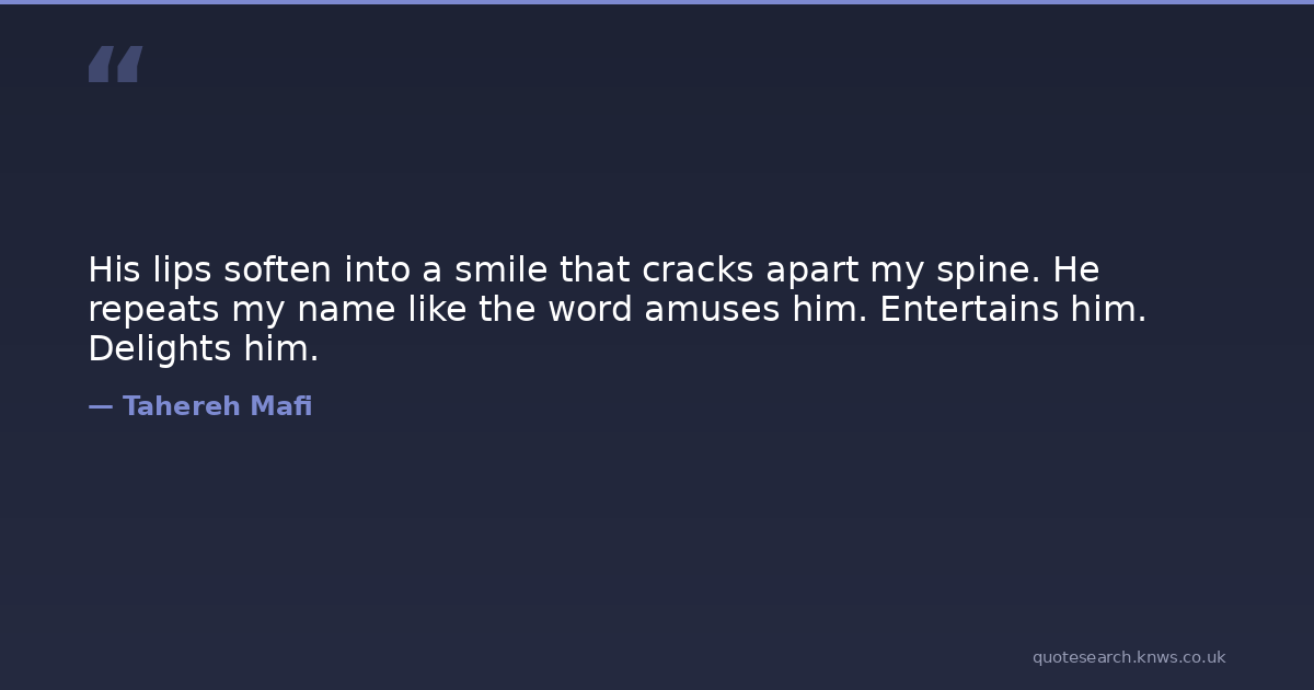 His lips soften into a smile that cracks apart my spine. He repeats my name like the word amuses him. Entertains him. Delights him.