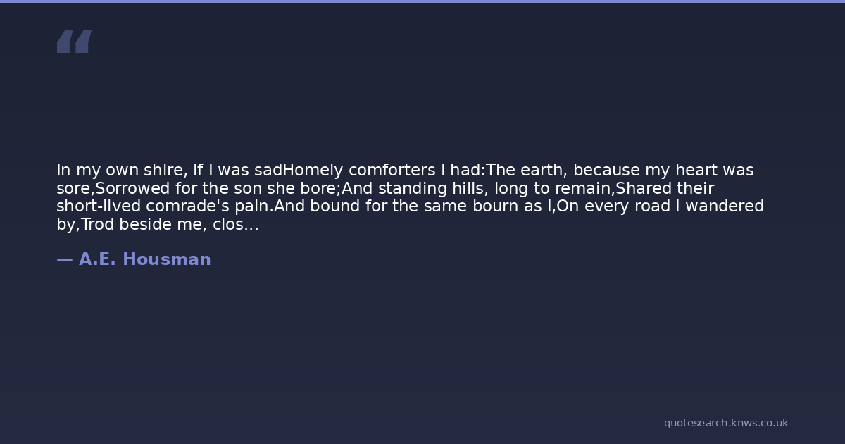 In my own shire, if I was sadHomely comforters I had:The earth, because my heart was sore,Sorrowed for the son she bore;And standing hills, long to remain,Shared their short-lived comrade's pain.And bound for the same bourn as I,On every road I wandered by,Trod beside me, close and dear,The beautiful and death-struck year:Whether in the woodland brownI heard the beechnut rustle down,And saw the purple crocus paleFlower about the autumn dale;Or littering far the fields of MayLady-smocks a-bleaching lay,And like a skylit water stoodThe bluebells in the azured wood. Yonder, lightening other loads,The season range the country roads,But here in London streets I kenNo such helpmates, only men;And these are not in plight to bear,If they would, another's care.They have enough as 'tis: I seeIn many an eye that measures meThe mortal sickness of a mindToo unhappy to be kind.Undone with misery, all they canIs to hate their fellow man;And till they drop they needs must stillLook at you and wish you ill.