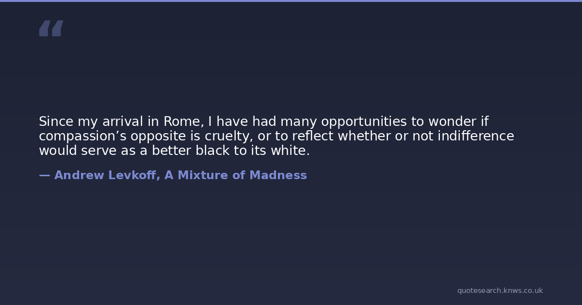 Since my arrival in Rome, I have had many opportunities to wonder if compassion’s opposite is cruelty, or to reflect whether or not indifference would serve as a better black to its white.