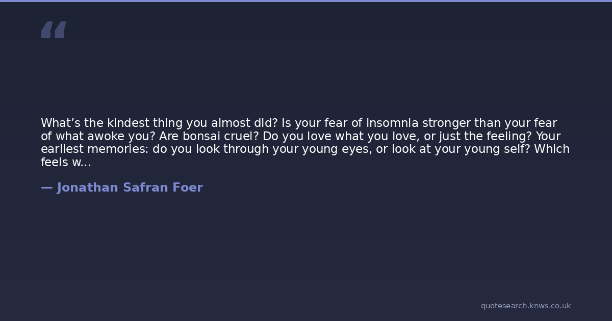 What’s the kindest thing you almost did? Is your fear of insomnia stronger than your fear of what awoke you? Are bonsai cruel? Do you love what you love, or just the feeling? Your earliest memories: do you look through your young eyes, or look at your young self? Which feels worse: to know that there are people who do more with less talent, or that there are people with more talent? Do you walk on moving walkways? Should it make any difference that you knew it was wrong �as you were doing it? Would you trade actual intelligence for the perception of being smarter? Why does it bother you when someone at the next table is having a conversation on a cell phone? How many years of your life would you trade for the greatest month of your life? What would you tell your father, if it were possible? Which is changing faster, your body, or your mind? Is it cruel to tell an old person his prognosis? Are you in any way angry at your phone? When you pass �a storefront, do you look at what’s inside, look at your reflection, or neither? Is there anything you would die for if no one could ever know you died for it? If you could be assured that money wouldn’t make �you any small bit happier, would you still want more money? What has �been irrevocably spoiled for you? If your deepest secret became public, �would you be forgiven? Is your best friend your kindest friend? Is it in any way cruel to give a dog a name? Is there anything you feel a need to confess? You know it’s a “murder of crows” and a “wake of buzzards” but it’s a what of ravens, again? What is it about death that you’re �afraid of? How does it make you feel to know that it’s an “unkindness �of ravens”?