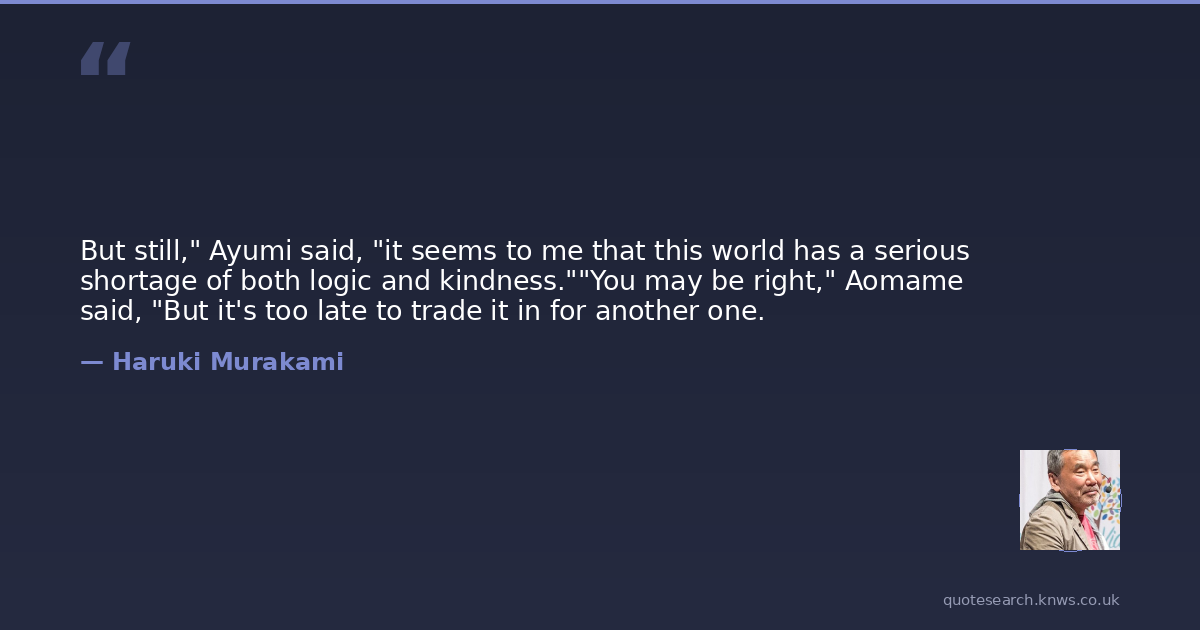 But still," Ayumi said, "it seems to me that this world has a serious shortage of both logic and kindness.""You may be right," Aomame said, "But it's too late to trade it in for another one.