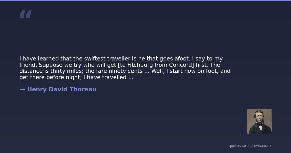 I have learned that the swiftest traveller is he that goes afoot. I say to my friend, Suppose we try who will get [to Fitchburg from Concord] first. The distance is thirty miles; the fare ninety cents ... Well, I start now on foot, and get there before night; I have travelled at that rate by the week together. You will in the meanwhile have earned your fare, and arrive there some time tomorrow, or possibly this evening, if you are lucky enough to get a job in season. Instead of going to Fitchburg, you will be working here the greater part of the day. And so, if the railroad reached round the world, I think that I should keep ahead of you; and as for seeing the country and getting experience of that kind, I should have to cut your acquaintance altogether.