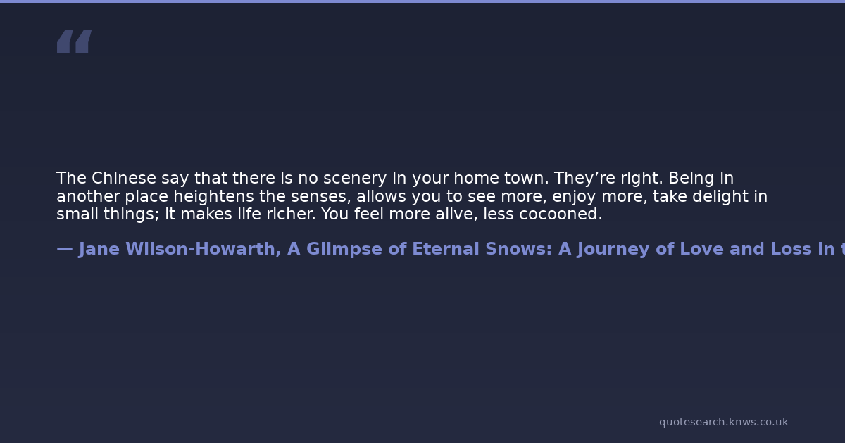 The Chinese say that there is no scenery in your home town. They’re right. Being in another place heightens the senses, allows you to see more, enjoy more, take delight in small things; it makes life richer. You feel more alive, less cocooned.