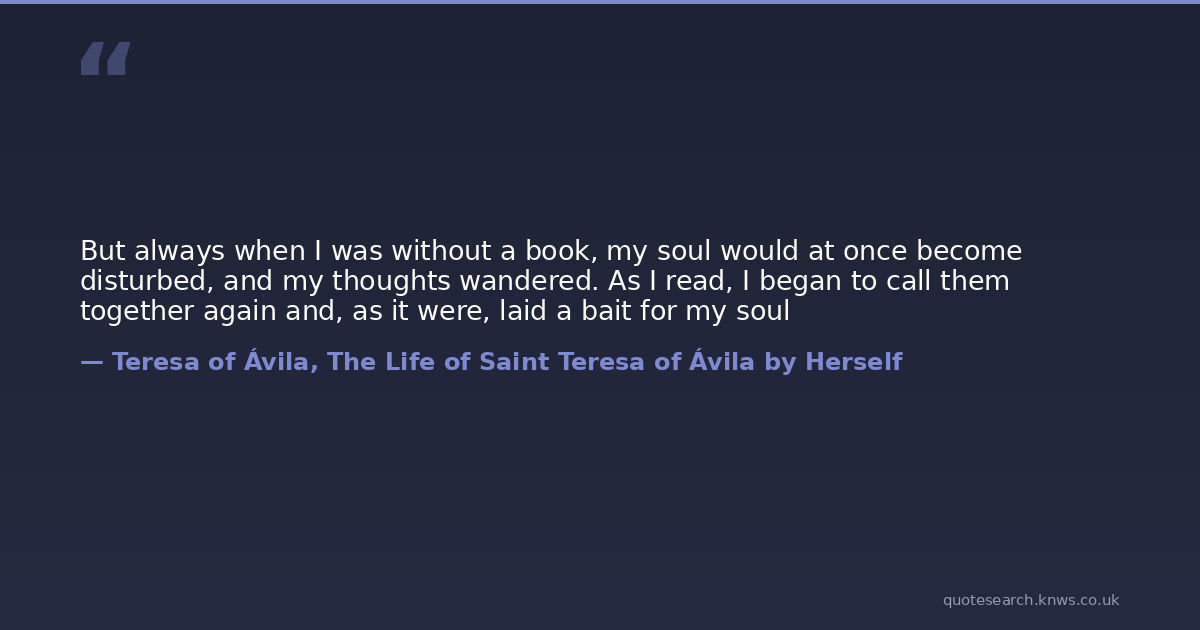 But always when I was without a book, my soul would at once become disturbed, and my thoughts wandered. As I read, I began to call them together again and, as it were, laid a bait for my soul