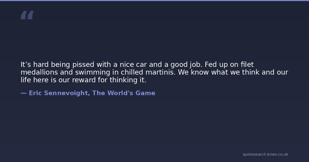 It’s hard being pissed with a nice car and a good job. Fed up on filet medallions and swimming in chilled martinis. We know what we think and our life here is our reward for thinking it.