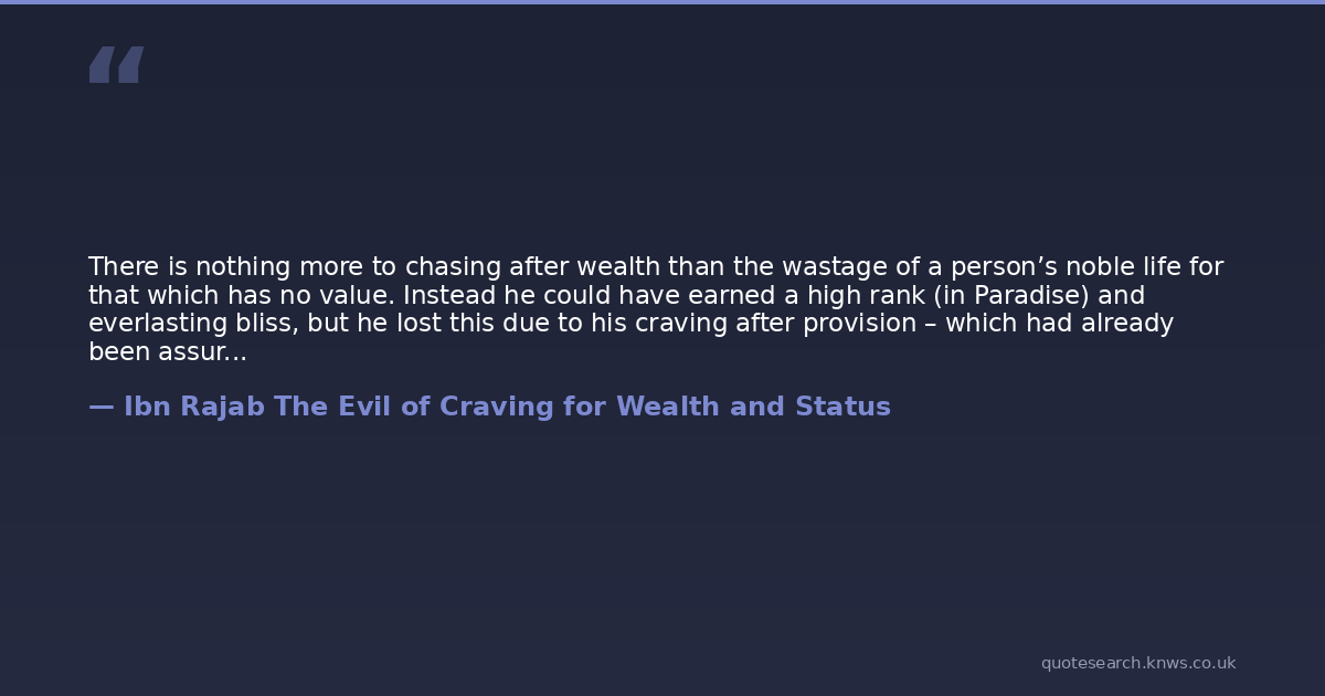 There is nothing more to chasing after wealth than the wastage of a person’s noble life for that which has no value. Instead he could have earned a high rank (in Paradise) and everlasting bliss, but he lost this due to his craving after provision – which had already been assured to him and allotted to him, and it was not possible for anything to come to him except what was decreed for him – then on top of this he does not benefit from that, but rather abandons it and leaves it for someone else.He departs from that and leaves it behind so that he will be the one held accountable for it, yet someone else benefits from it. So in reality he is only gathering it, yet someoneelse benefits from it. So in reality he is only gathering it for someone who will not praise him for that, whilst he himself goes on to One who will not excuse him for that – this itself would indeed be enough to show the blameworthiness of this craving.