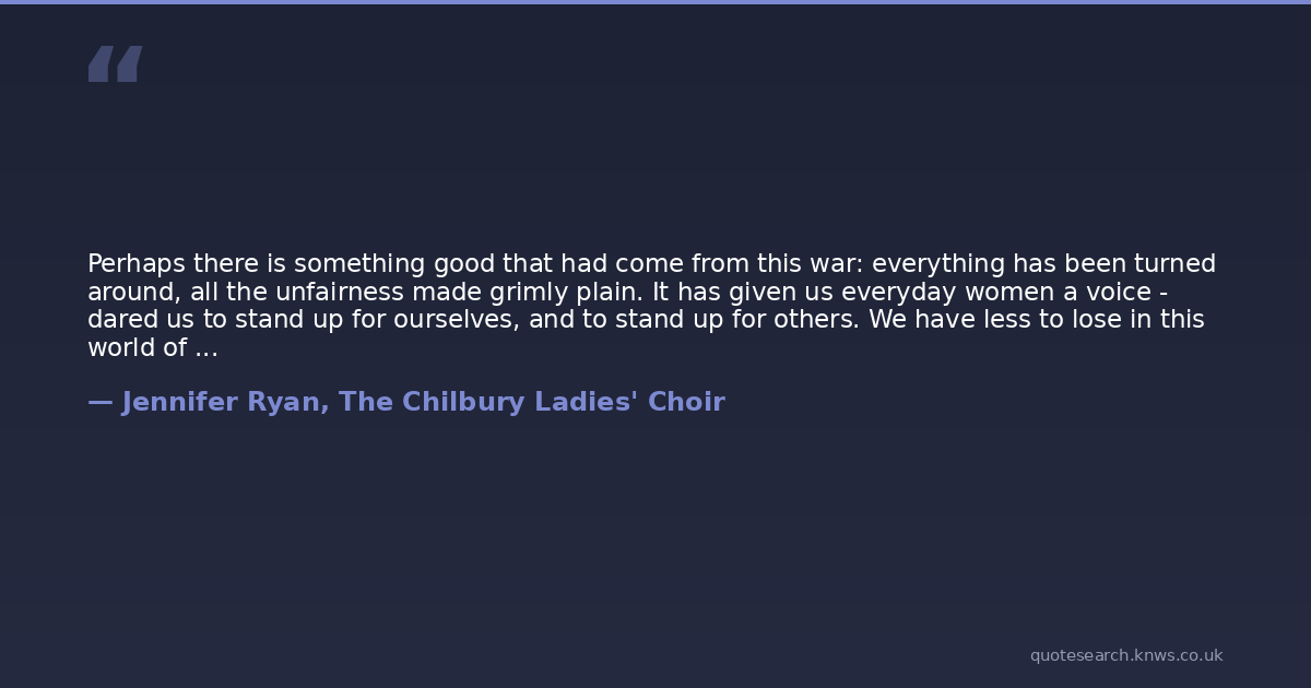 Perhaps there is something good that had come from this war: everything has been turned around, all the unfairness made grimly plain. It has given us everyday women a voice - dared us to stand up for ourselves, and to stand up for others. We have less to lose in this world of chaos and death, after all.