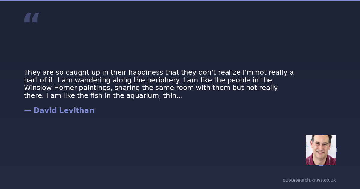 They are so caught up in their happiness that they don't realize I'm not really a part of it. I am wandering along the periphery. I am like the people in the Winslow Homer paintings, sharing the same room with them but not really there. I am like the fish in the aquarium, thinking in a different language, adapting to a life that's not my natural habitat. I am the people in the other cars, each with his or her own story, but passing too quickly to be noticed or understood. . . . There are moments I just sit in my frame, float in my tank, ride in my car and say nothing, think nothing that connects me to anything at all.