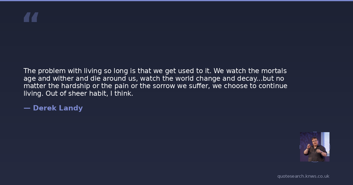 The problem with living so long is that we get used to it. We watch the mortals age and wither and die around us, watch the world change and decay...but no matter the hardship or the pain or the sorrow we suffer, we choose to continue living. Out of sheer habit, I think.