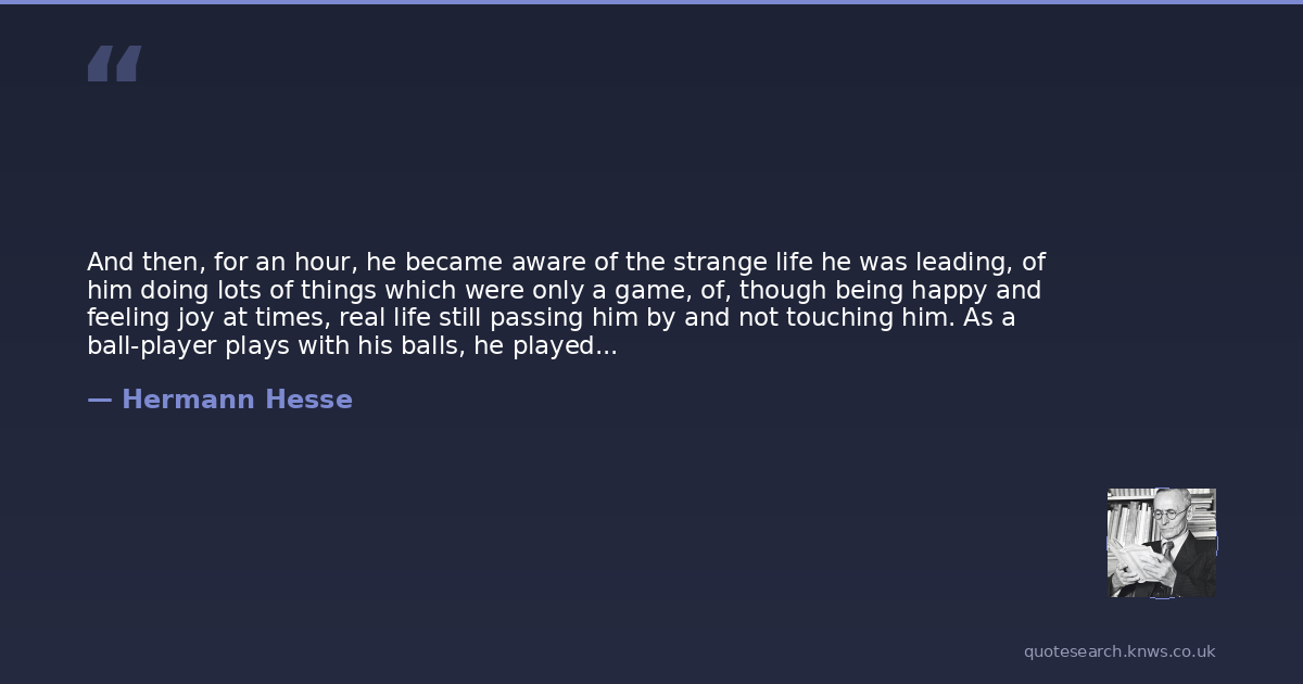 And then, for an hour, he became aware of the strange life he was leading, of him doing lots of things which were only a game, of, though being happy and feeling joy at times, real life still passing him by and not touching him. As a ball-player plays with his balls, he played with his business-deals, with the people around him, watched them, found amusement in them; with his heart, with the source of his being, he was not with them. The source ran somewhere, far away from him, ran and ran invisibly, had nothing to do with his life any more. And at several times he suddenly became scared on account of such thoughts and wished that he would also be gifted with the ability to participate in all of this childlike-naive occupations of the daytime with passion and with his heart, really to live, really to act, really to enjoy and to live instead of just standing by as a spectator.