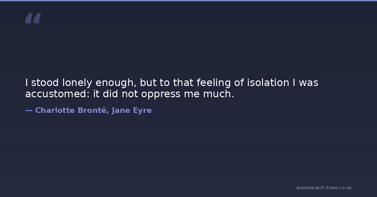 I stood lonely enough, but to that feeling of isolation I was accustomed: it did not oppress me much. isolation loneliness Download Image Share on X Share on Facebook Copy Link