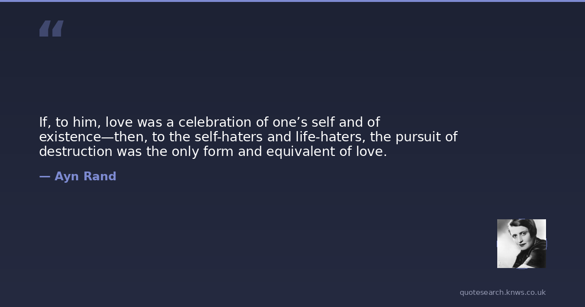 If, to him, love was a celebration of one’s self and of existence—then, to the self-haters and life-haters, the pursuit of destruction was the only form and equivalent of love.