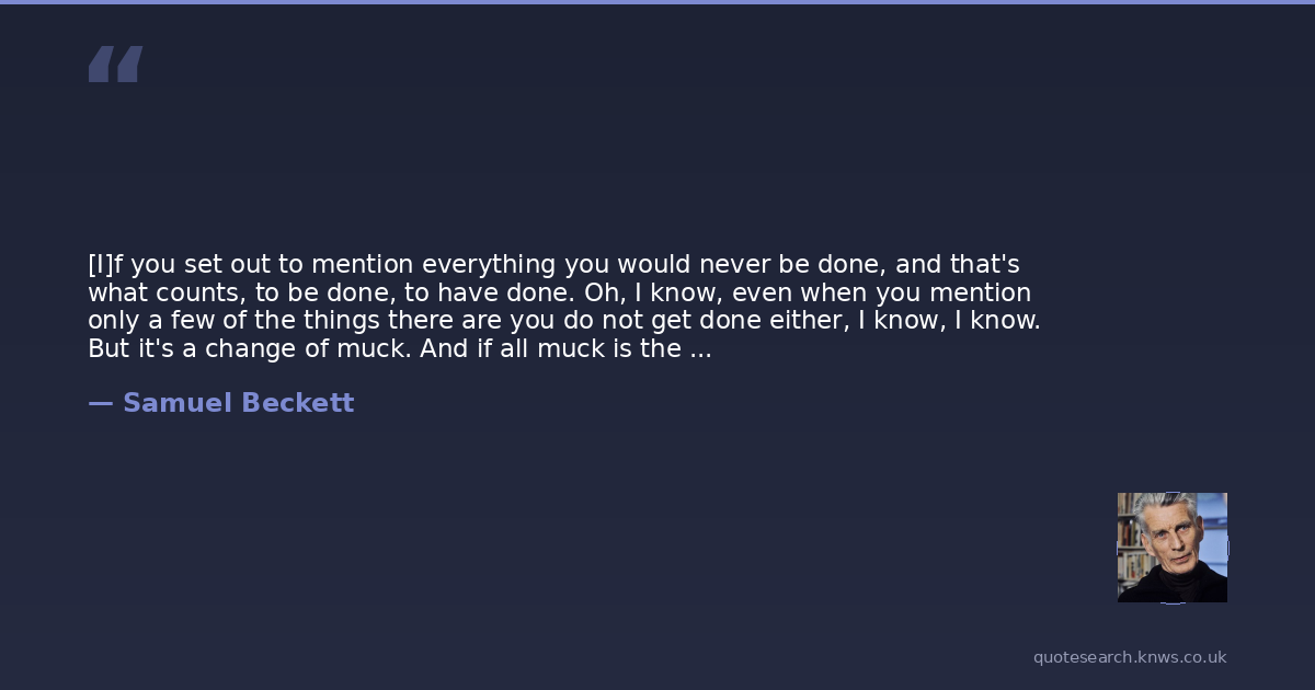 [I]f you set out to mention everything you would never be done, and that's what counts, to be done, to have done. Oh, I know, even when you mention only a few of the things there are you do not get done either, I know, I know. But it's a change of muck. And if all muck is the same muck that doesn't matter, it's good to have a change of muck, to move from one heap to another, from time to time, fluttering you might say, like a butterfly, as if you were ephemeral.
