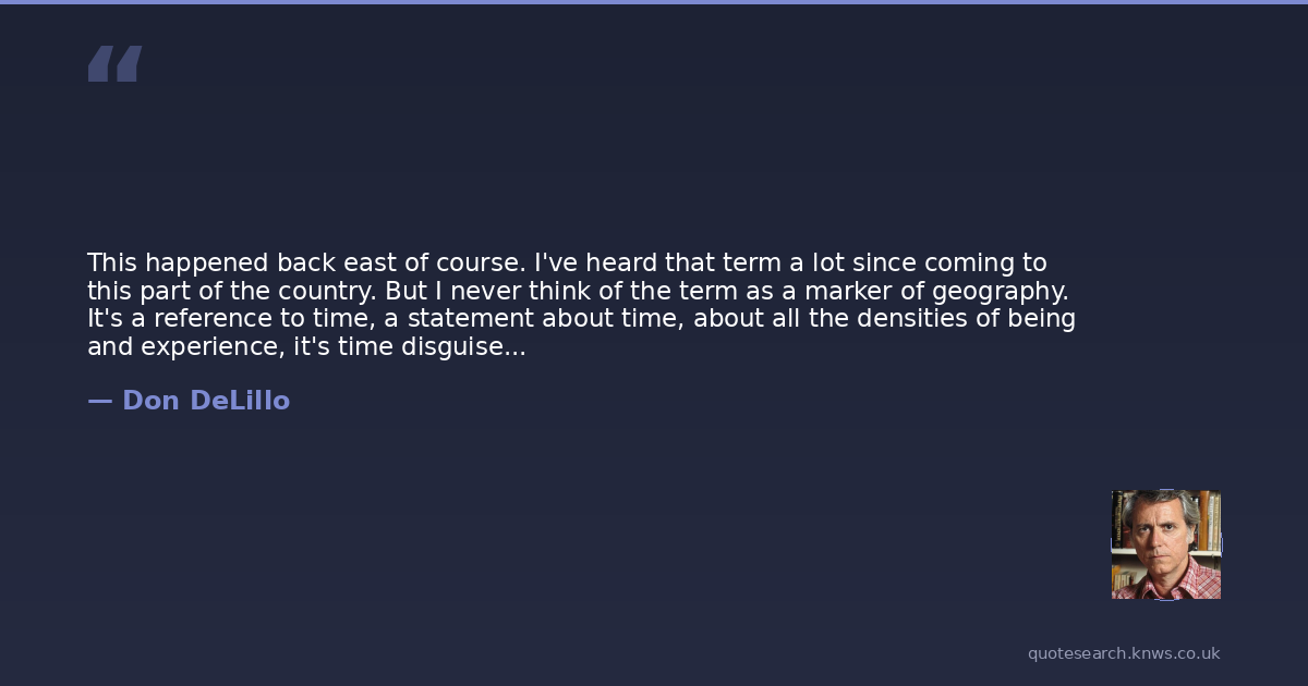 This happened back east of course. I've heard that term a lot since coming to this part of the country. But I never think of the term as a marker of geography. It's a reference to time, a statement about time, about all the densities of being and experience, it's time disguised, it's light-up time, shifting smoky time tricked out as some locus of stable arrangement. When people use that term they're talking about the way things used to be before they moved out here, the way the world used to be, not just New Jersey or South Philly, or before their parents moved, or grandparents, and about the way things still exist in some private relativity theory, some smoky shifting mind dimension, or before the other men and women came this way, the ones in Conestoga wagons, a term we learned in grade school, a back-east term, stemming from the place where the wagons were made. (pg.333)
