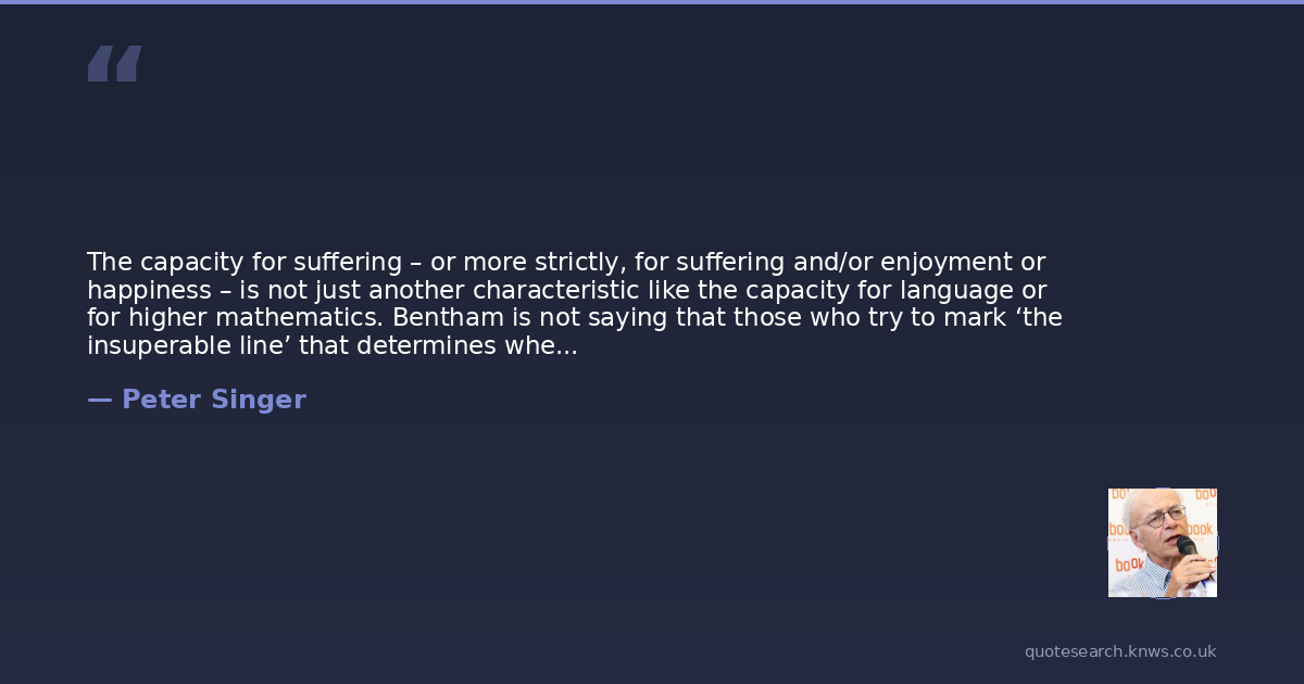 The capacity for suffering – or more strictly, for suffering and/or enjoyment or happiness – is not just another characteristic like the capacity for language or for higher mathematics. Bentham is not saying that those who try to mark ‘the insuperable line’ that determines whether the interests of a being should be considered happen to have selected the wrong characteristic. The capacity for suffering and enjoying things is a prerequisite for having interests at all, a condition that must be satisfied before we can speak of interests in any meaningful way. It would be nonsense to say that it was not in the interests of a stone to be kicked along the road by a child. A stone does not have interests because it cannot suffer. Nothing that we can do to it could possibly make any difference to its welfare. A mouse, on the other hand, does have an interest in not being tormented, because mice will suffer if they are treated in this way.