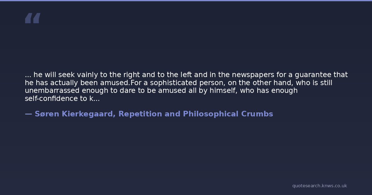 ... he will seek vainly to the right and to the left and in the newspapers for a guarantee that he has actually been amused.For a sophisticated person, on the other hand, who is still unembarrassed enough to dare to be amused all by himself, who has enough self-confidence to know, without seeking advice from anyone else, whether he has been amused, farce will perhaps have a very special meaning, in that now with the spaciousness of abstraction and now with the presentation of a tangible actuality, it will affect his mood differently.He will, of course refrain from bringing a fixed and definite mood with him so that everything affects him in relation to that mood. He will have perfected his mood, in that he will be able to keep himself in a condition where no particular mood is present, but where all moods are possible.