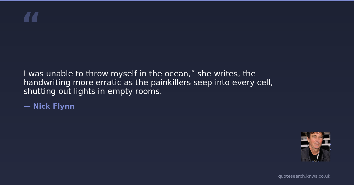 I was unable to throw myself in the ocean,” she writes, the handwriting more erratic as the painkillers seep into every cell, shutting out lights in empty rooms.