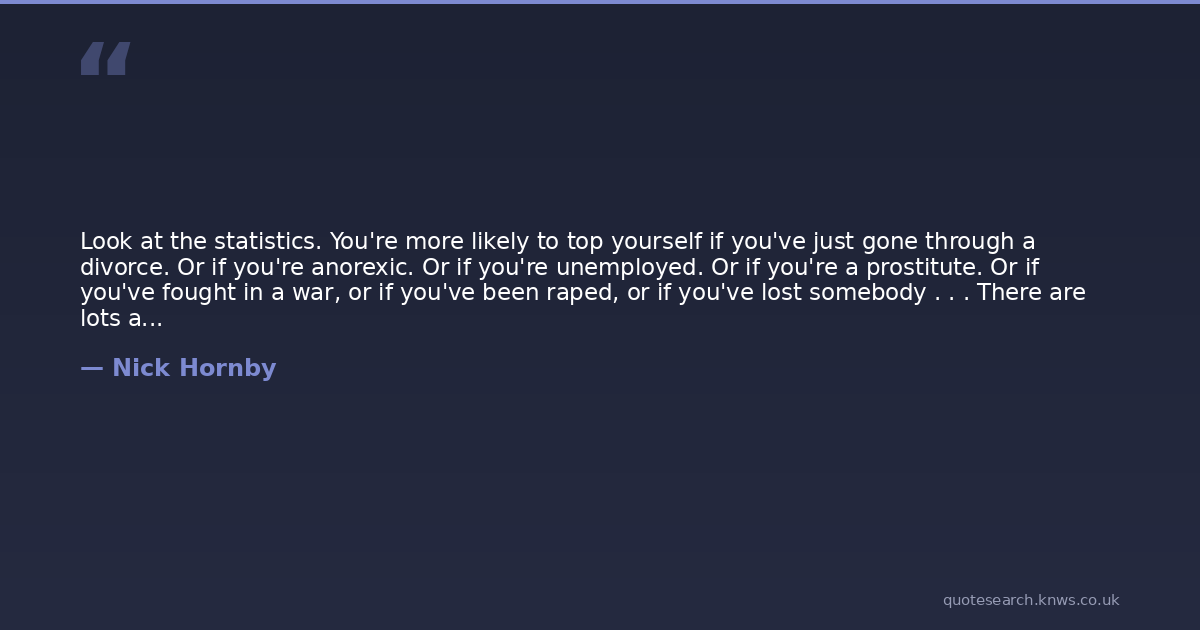 Look at the statistics. You're more likely to top yourself if you've just gone through a divorce. Or if you're anorexic. Or if you're unemployed. Or if you're a prostitute. Or if you've fought in a war, or if you've been raped, or if you've lost somebody . . . There are lots and lots of factors that push people over the edge; none of these factors are likely to make you feel anything but fucking miserable.