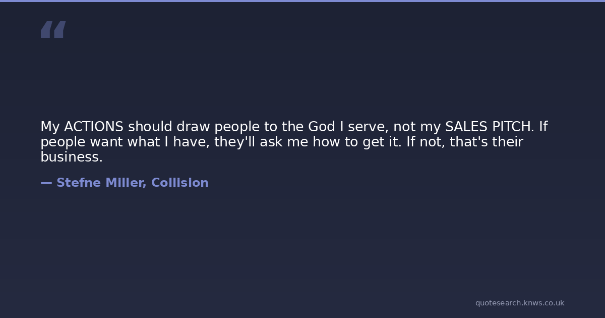 My ACTIONS should draw people to the God I serve, not my SALES PITCH. If people want what I have, they'll ask me how to get it. If not, that's their business.