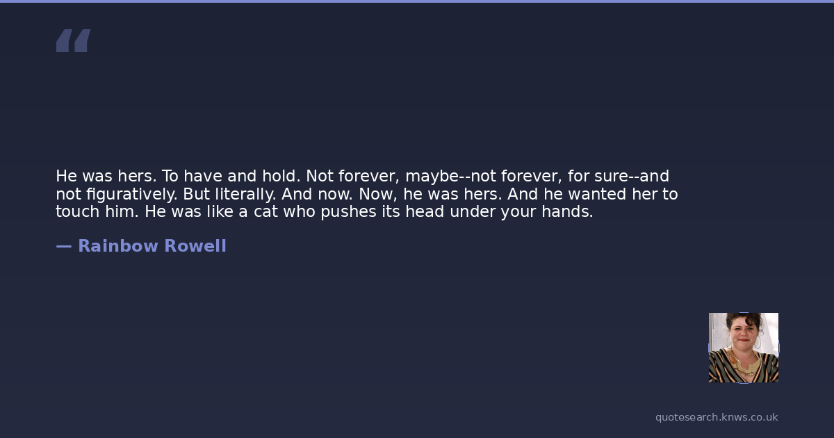 He was hers. To have and hold. Not forever, maybe--not forever, for sure--and not figuratively. But literally. And now. Now, he was hers. And he wanted her to touch him. He was like a cat who pushes its head under your hands.