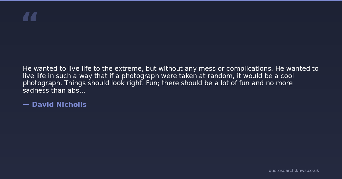 He wanted to live life to the extreme, but without any mess or complications. He wanted to live life in such a way that if a photograph were taken at random, it would be a cool photograph. Things should look right. Fun; there should be a lot of fun and no more sadness than absolutely necessary.