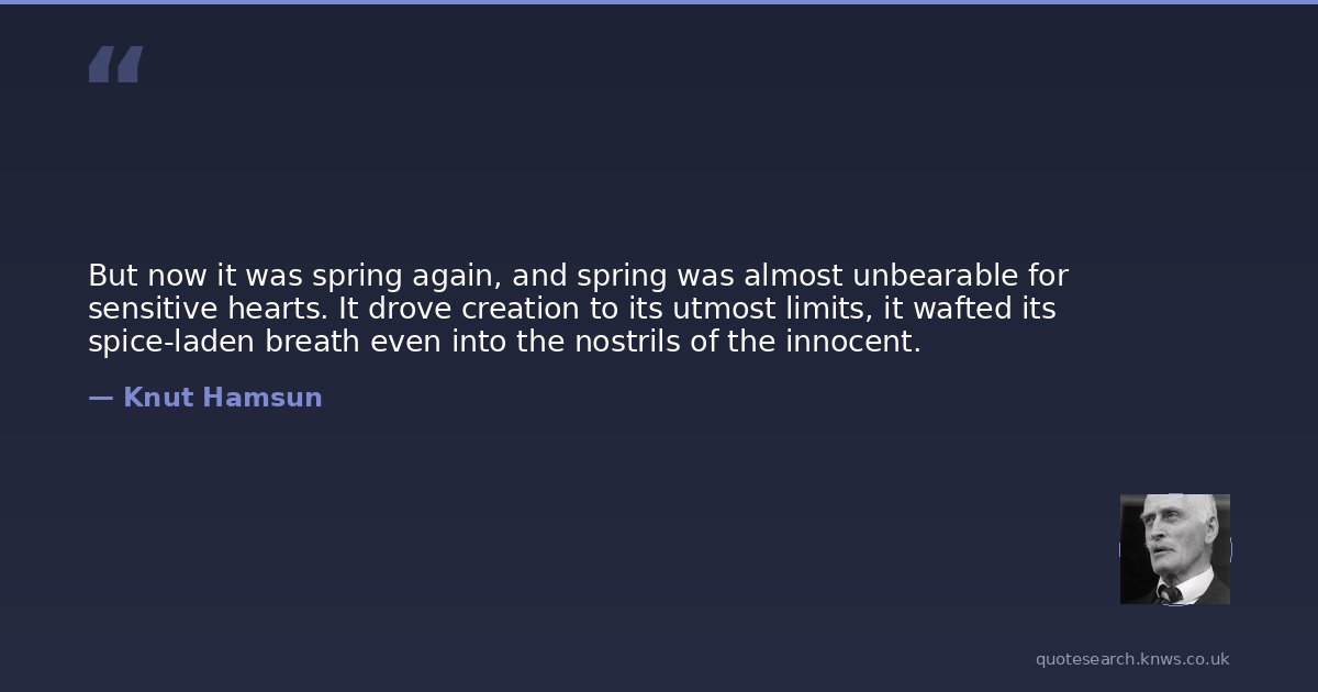 But now it was spring again, and spring was almost unbearable for sensitive hearts. It drove creation to its utmost limits, it wafted its spice-laden breath even into the nostrils of the innocent.