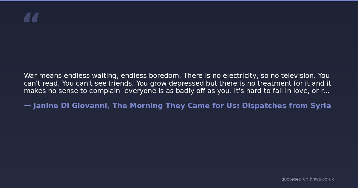 War means endless waiting, endless boredom. There is no electricity, so no television. You can't read. You can't see friends. You grow depressed but there is no treatment for it and it makes no sense to complain everyone is as badly off as you. It's hard to fall in love, or rather, hard to stay in love. If you are a teenager, you seem halted in time.If you are critically ill with cancer, for instance there is no chemotherapy for you. If you can't leave the country for treatment, you stay and die slowly, and in tremendous pain. Victorian diseases return polio, typhoid and cholera. You see very sick people around you who seemed in perfectly good health when you last saw them during peacetime. You hear coughing all the time. Everyone hacks from the dust of destroyed buildings, from disease, from cold.As for your old world, it disappears, like the smoke from a cigarette you can no longer afford to buy. Where are your closest friends? Some have left, others are dead. The few who remain have nothing new to talk about. You can't get to their houses, because the road is blocked by checkpoints. Or snipers take a shot when you leave your door, so you scurry back inside, like a crab retreating inside its shell. Or you might go out on the wrong day and a barrel bomb, dropped by a government helicopter, lands near you.Wartime looks like this.