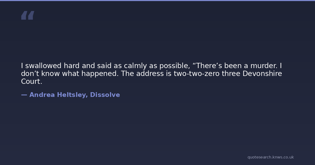 I swallowed hard and said as calmly as possible, “There’s been a murder. I don’t know what happened. The address is two-two-zero three Devonshire Court.