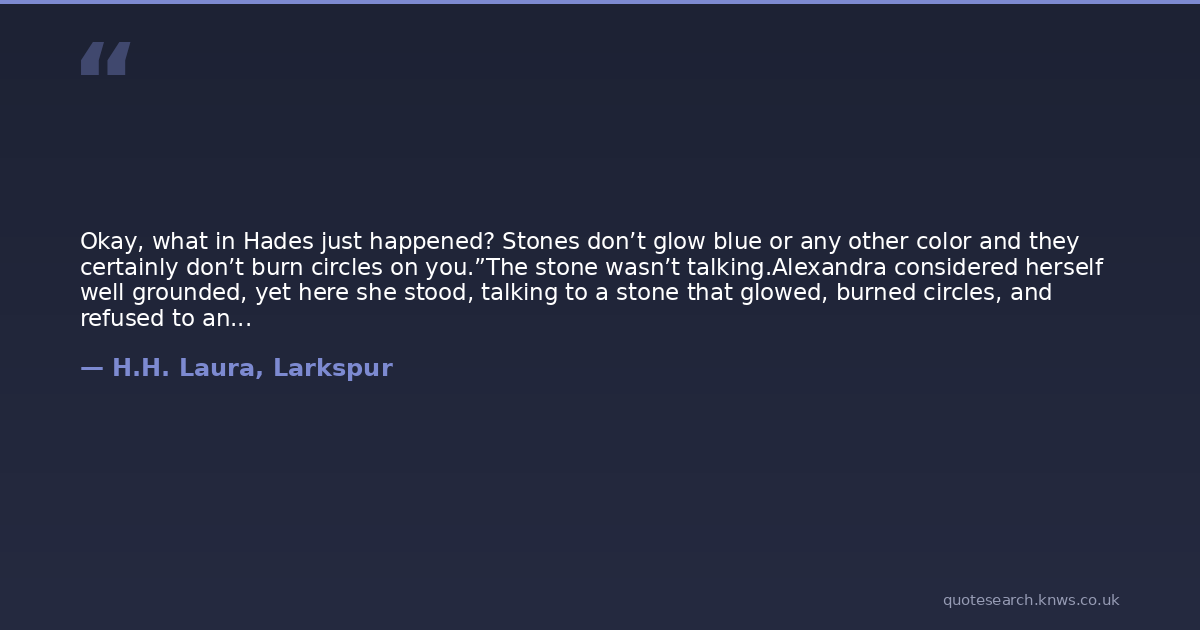 Okay, what in Hades just happened? Stones don’t glow blue or any other color and they certainly don’t burn circles on you.”The stone wasn’t talking.Alexandra considered herself well grounded, yet here she stood, talking to a stone that glowed, burned circles, and refused to answer.A thread of sensation pricked at the edges of her mind, then grew stronger. It mirrored an idea then became c