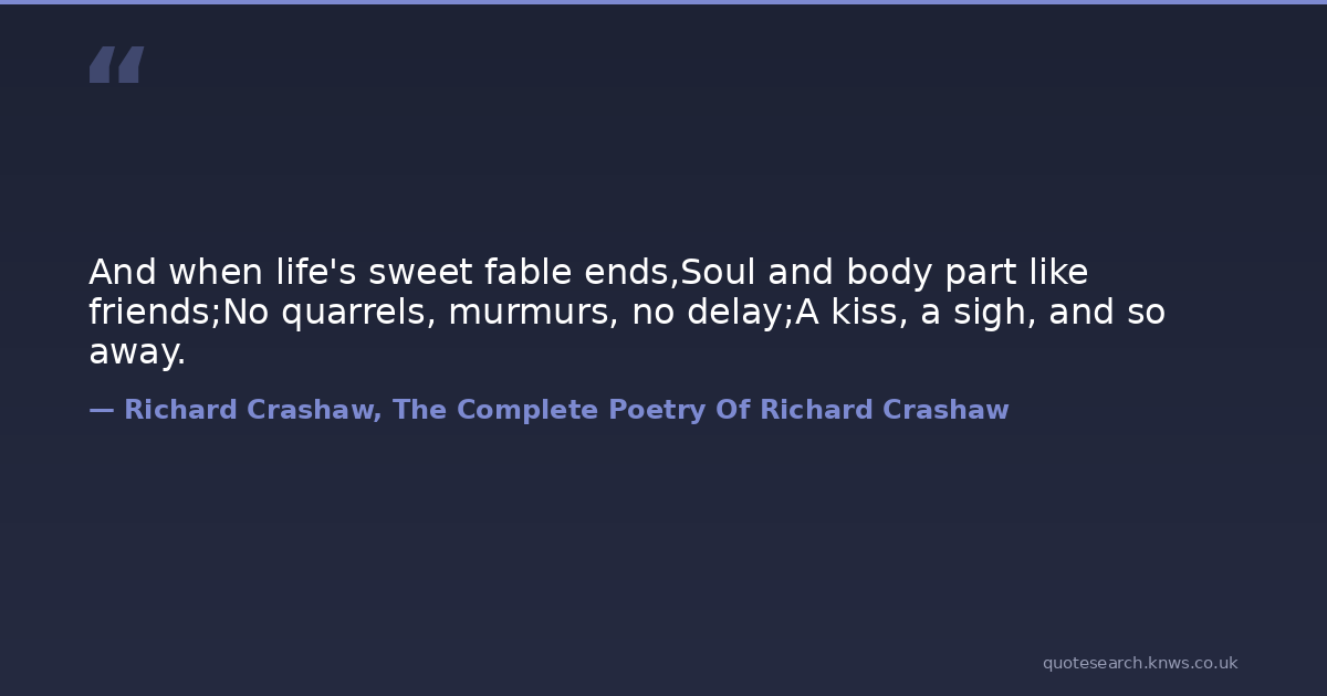And when life's sweet fable ends,Soul and body part like friends;No quarrels, murmurs, no delay;A kiss, a sigh, and so away. death life Download Image Share on X Share on Facebook Copy Link