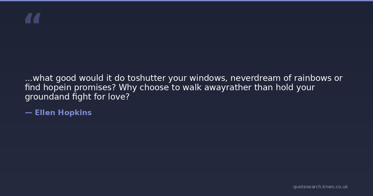 ...what good would it do toshutter your windows, neverdream of rainbows or find hopein promises? Why choose to walk awayrather than hold your groundand fight for love?
