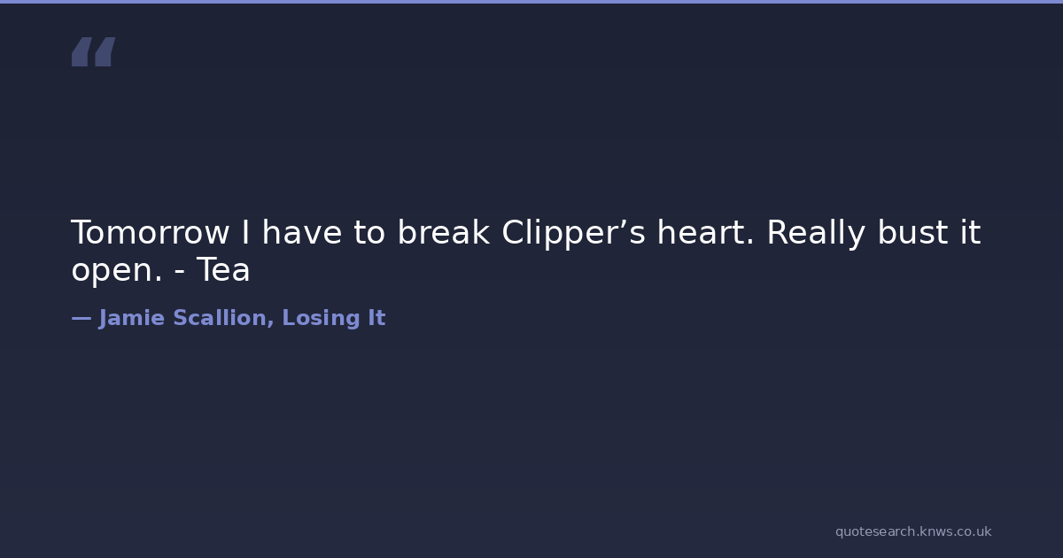 Tomorrow I have to break Clipper’s heart. Really bust it open. - Tea young-adult young-adult-fiction young-adult-series Download Image Share on X Share on Facebook Copy Link