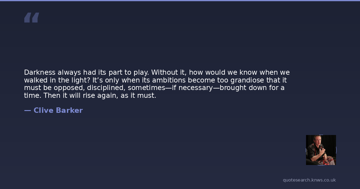 Darkness always had its part to play. Without it, how would we know when we walked in the light? It’s only when its ambitions become too grandiose that it must be opposed, disciplined, sometimes—if necessary—brought down for a time. Then it will rise again, as it must.