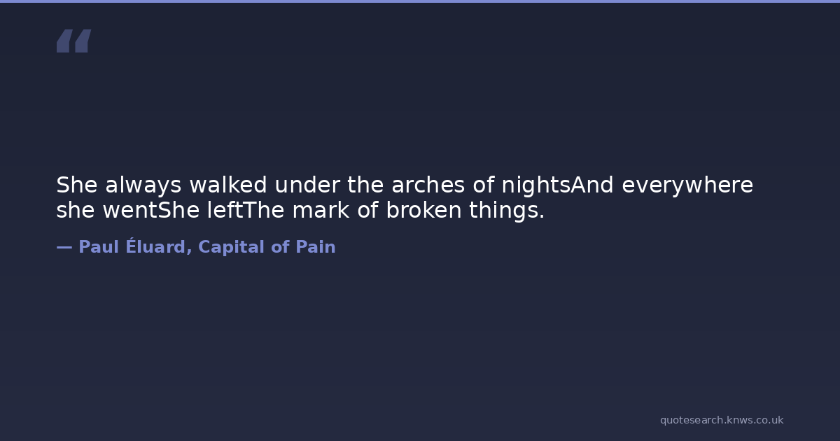 She always walked under the arches of nightsAnd everywhere she wentShe leftThe mark of broken things.