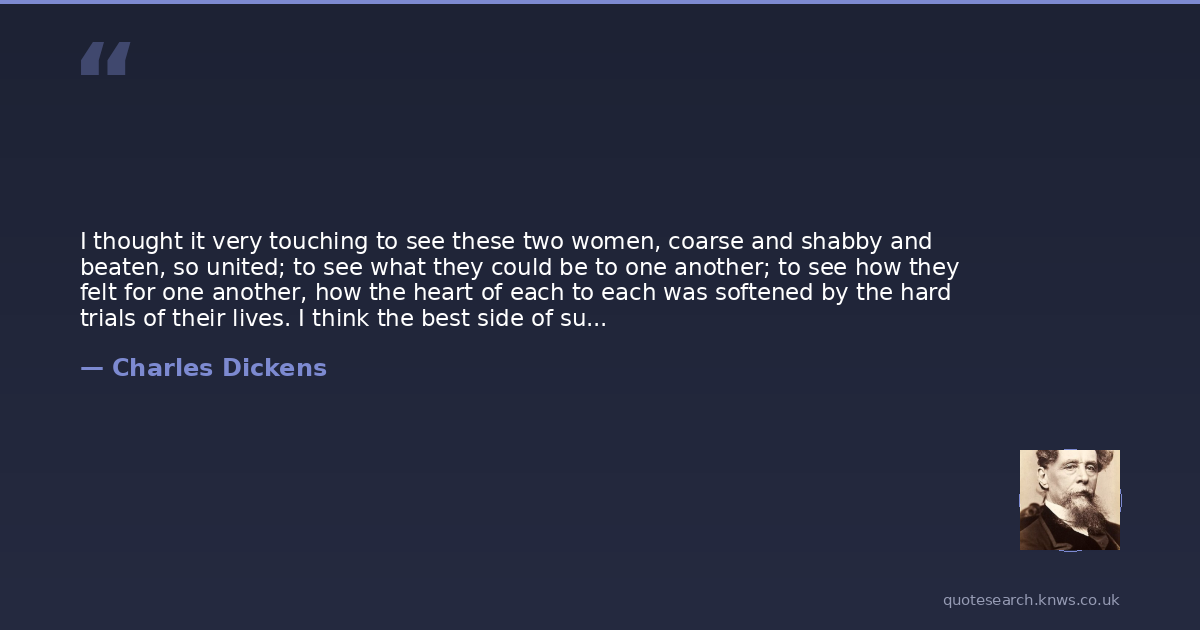 I thought it very touching to see these two women, coarse and shabby and beaten, so united; to see what they could be to one another; to see how they felt for one another, how the heart of each to each was softened by the hard trials of their lives. I think the best side of such people is almost hidden from us. What the poor are to the poor is little known, excepting to themselves and God.