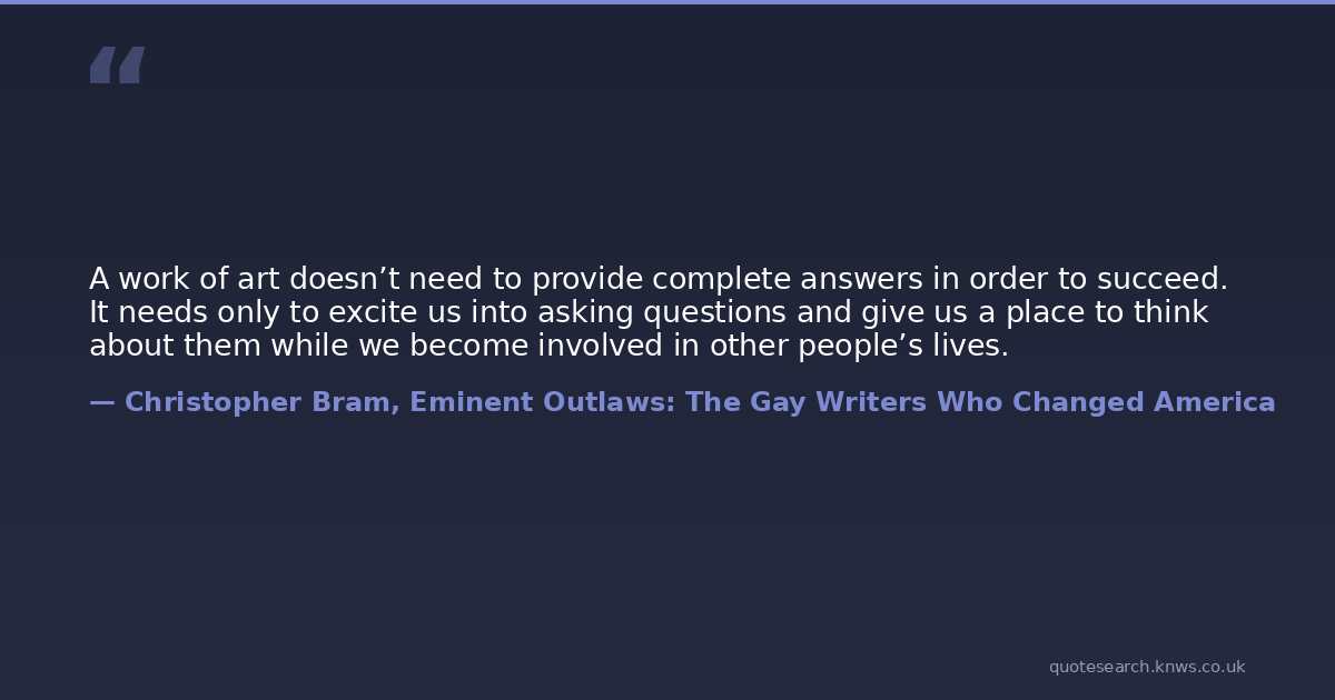 A work of art doesn’t need to provide complete answers in order to succeed. It needs only to excite us into asking questions and give us a place to think about them while we become involved in other people’s lives.